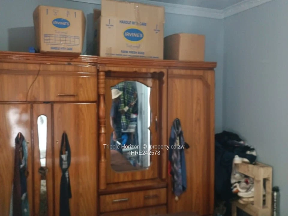 Solid family home in Warren Park (Harare High Density) — 4 beds, 2 baths on a 200 m² stand with 150 m² under roof. The freshly painted exterior and neat verandah with brick pillars welcome you into a comfortable lounge fitted with a full sofa suite, TV area and tasteful curtains. Interiors show decorative cornices and good wooden doors; one bedroom includes a large built-in wardrobe. Outside you’ll find a tidy front garden/vegetable patch and off-street parking on a compact yard.