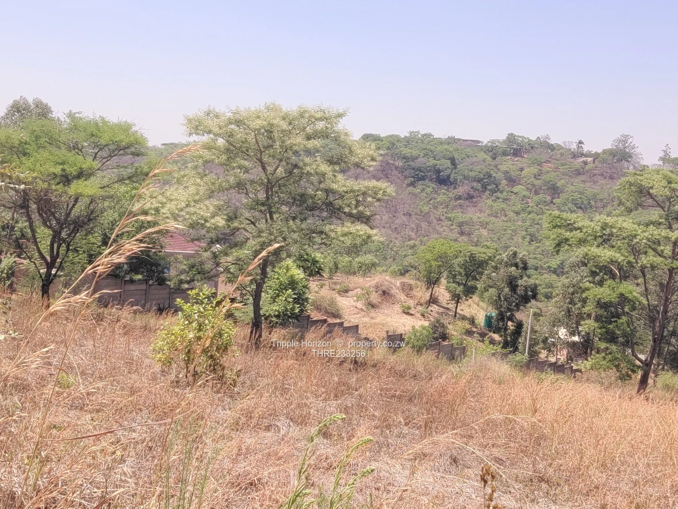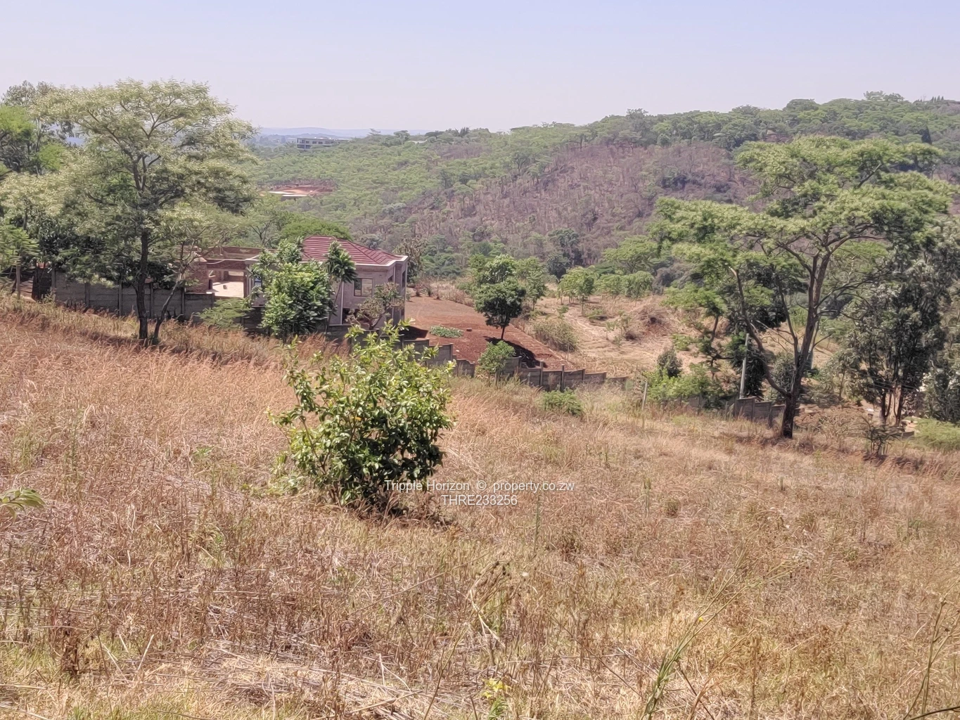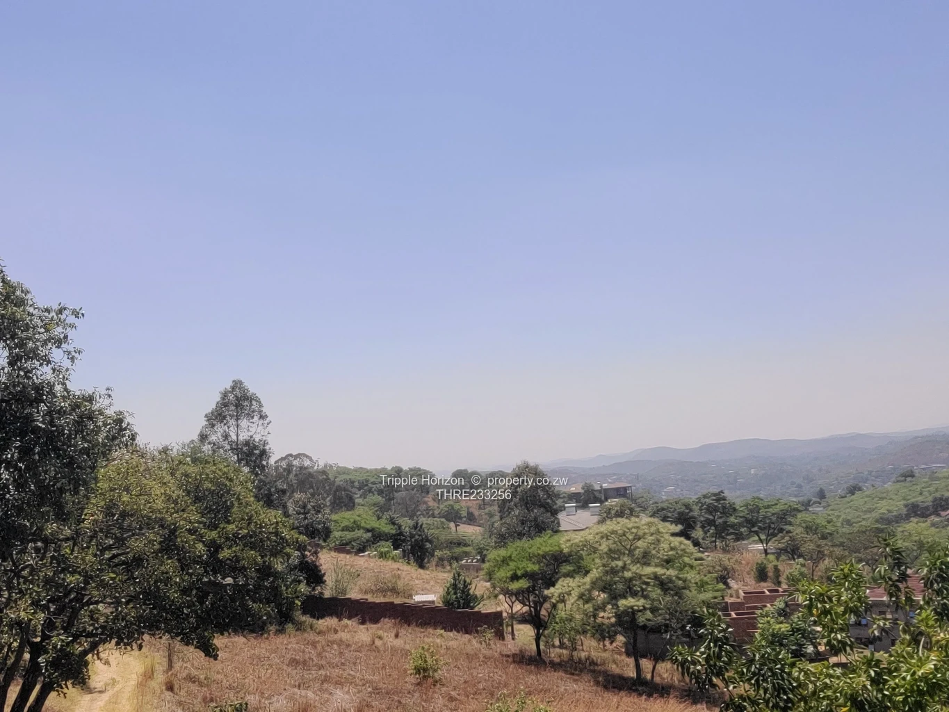 Prime development opportunity on Hogerty Hill, Harare North — 1.60 hectares of elevated, scenically undulating land with sweeping valley and hilltop views. The photos show open grass-covered slopes dotted with mature indigenous trees and shrubs, natural terraces and gentle gradients that are ideal for phased subdivision, a private family estate or a boutique gated development. From vantage points across the site you can see neighbouring homes nestled in the valley and distant ridgelines under clear blue skies, promising sun-filled mornings and cool evening breezes.