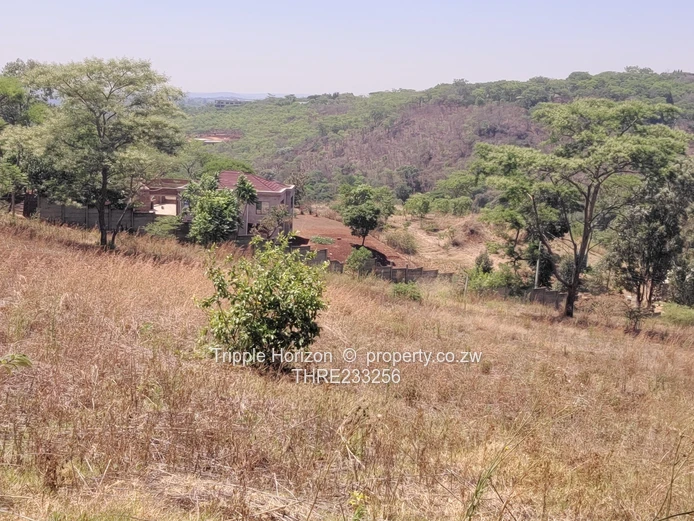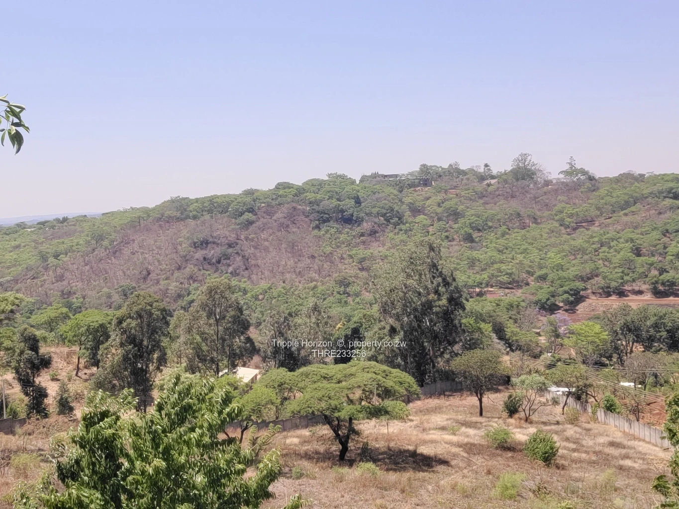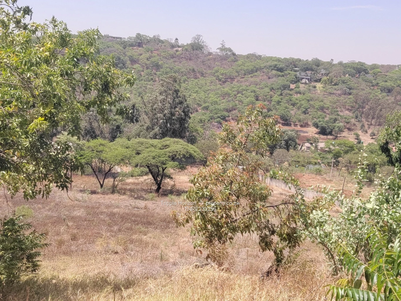 Prime development opportunity on Hogerty Hill, Harare North — 1.60 hectares of elevated, scenically undulating land with sweeping valley and hilltop views. The photos show open grass-covered slopes dotted with mature indigenous trees and shrubs, natural terraces and gentle gradients that are ideal for phased subdivision, a private family estate or a boutique gated development. From vantage points across the site you can see neighbouring homes nestled in the valley and distant ridgelines under clear blue skies, promising sun-filled mornings and cool evening breezes.
